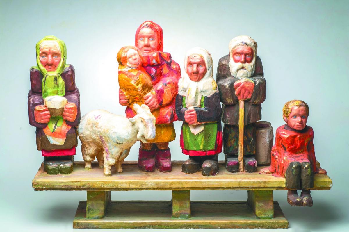 Тема деревни и простых людей из народа – одна из ведущих в творчестве скульптора. Старики в телогрейках и валенках, старухи в платках, ребятишки, коза… Работы, выполненные в дереве и раскрашенные темперной краской, очень характерны, в них сама соль русской жизни – нелёгкой да горькой, стойкой и терпеливой. Милая, родная, старая русская деревня, уходящая навсегда.