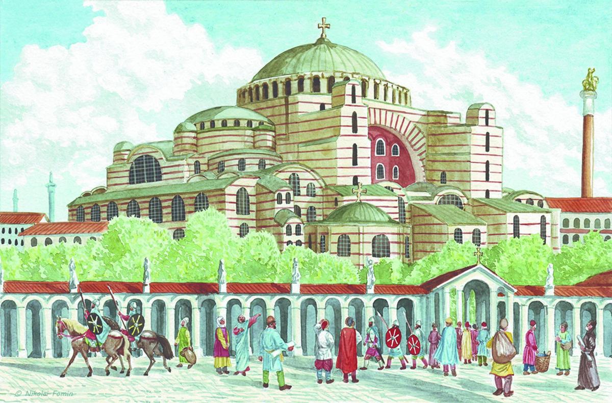 Третьей выдающейся постройкой стал храм Святой Софии, посвящённый Христу как Премудрости Божией. На древнегреческом языке «мудрость» называлась «софия», и это имя перестроенный позднее собор сохранил до наших дней. Посвящение императорской церкви Святой Софии таинственно. Для христиан Премудрость Божия означала воплотившегося Иисуса Христа. В последующие столетия одноимённые храмы возникнут и в других христианских странах. И на протяжении многих веков дискуссии о значении этого мистического названия будут занимать умы историков, философов и богословов.